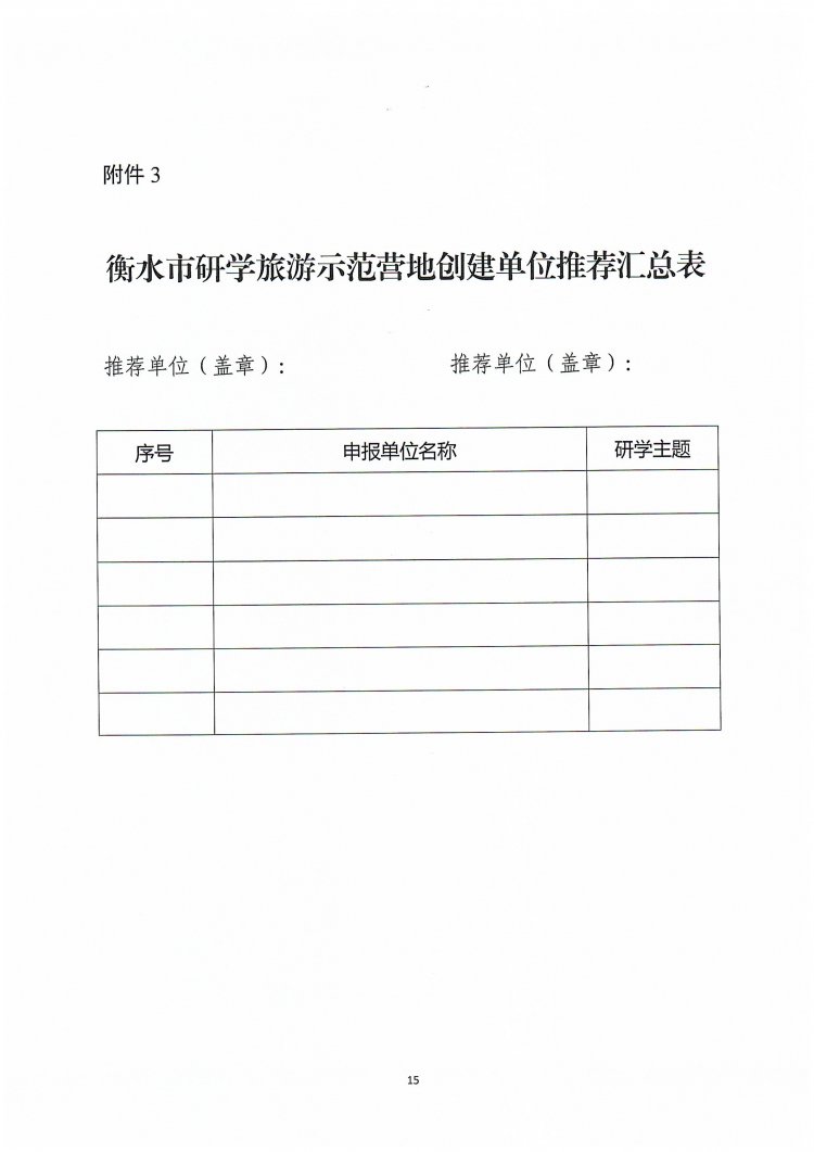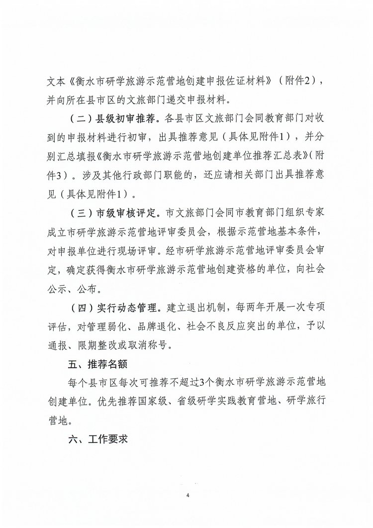 为全面提升我市研学旅游发展水平,打造高品质研学旅游营地 ,满足广大游客研学旅游需求,提升衡水研学旅游知名度和影响力, 树立具有衡水特色的研学旅游品牌,助力打造全国知名的研学之都, 经市研学旅游工作专班研究决定,正式启动2024年度衡水市研学旅游 示范营地评定工作。请各县市区市研学旅游工作专班结合本地实 际,根据《衡水市研学旅游示范营地创建与评定工作规程(试行) 》要求,认真组织开展2024年度衡水市研学旅游示范营地申报和 初评工作,进一步提高研学营地建设水平和服务质量。相关材料 请于6月12日前报市市研学旅游工作专班办公室。