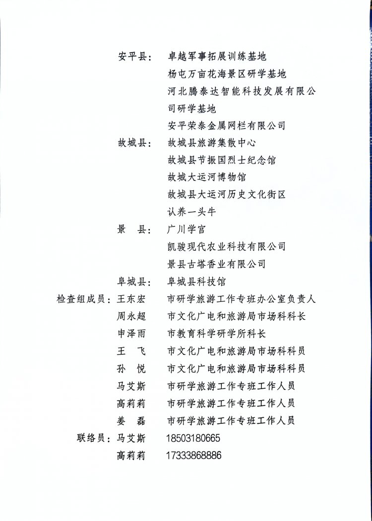 本次检查时间紧,任务重,请各县市区研学旅游工作专班高度重视,明确专人负责,积极沟通协调当地教育部门共同参与验收,认真组织,积极配合,全力做好各项检查准备工作,确保高质量评定第三批衡水市研学旅游示范基地。请各县市区具体负责人员主动与联络员进行联系,商定具体验收时间。