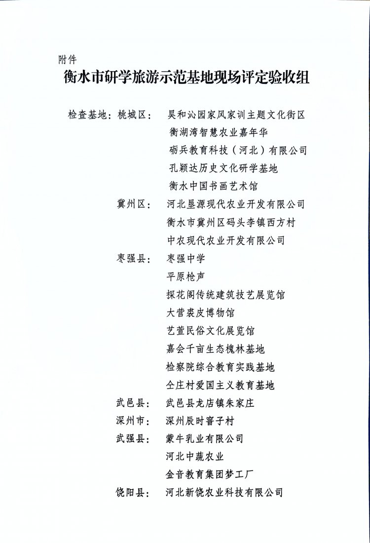 按照衡水市研学旅游工作专班工作安排,为全面提升我市研学旅游发展水平,打造高品质研学旅游基地,根据《衡水市研学旅游示范基地创建与评定工作规程(试行)》相关要求,在全市常态化开展衡水市研学旅游示范基地评定工作,拟于近期评定第三批衡水市研学旅游示范基地。现就集中开展现场评定验收工作通知如下: